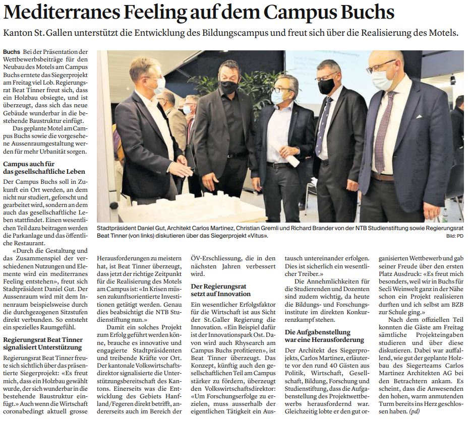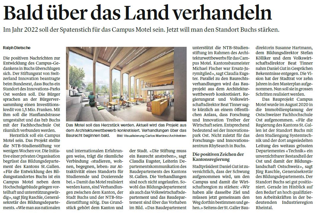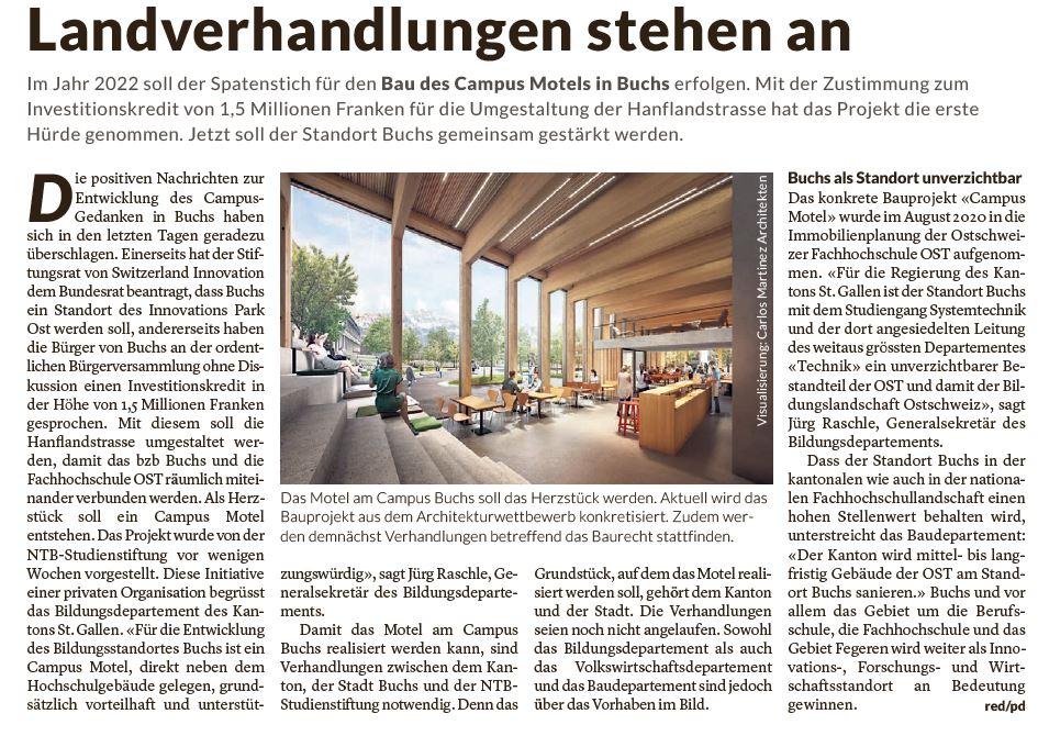 Im Jahr 2022 soll der Spatenstich für den Bau des Campus Motel in Buchs erfolgen. Mit der Zustimmung zum Investitionskredit von 1,5 Millionen Franken für die Umgestaltung der Hanflandstrasse hat das Projekt die erste Hürde genommen. Jetzt soll der Standort Buchs gemeinsam gestärkt werden.