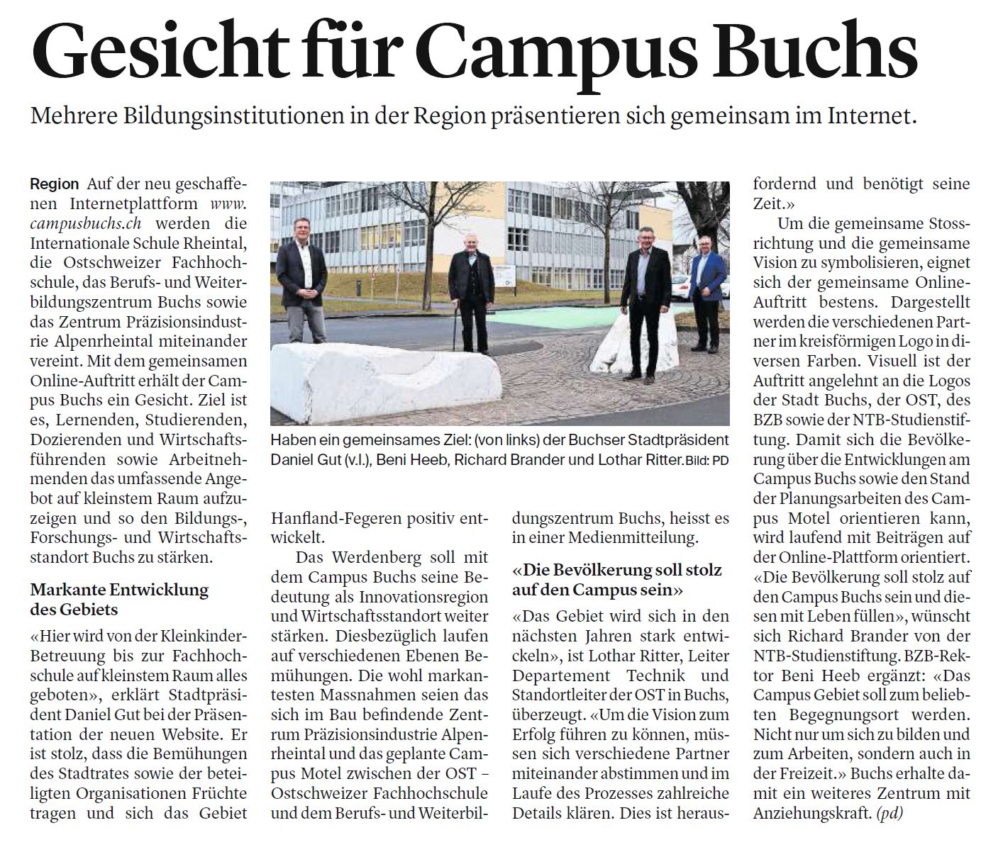 Der neu gegründete Verein Hightech-Campus Buchs treibt die ganzheitliche Campus-Entwicklung, Belebung und Vermarktung voran. Ziel ist es, den Bildungs- und Forschungsstandort Buchs zu stärken sowie die gemeinsamen Interessen zu koordinieren und diese gegen aussen zu vertreten.